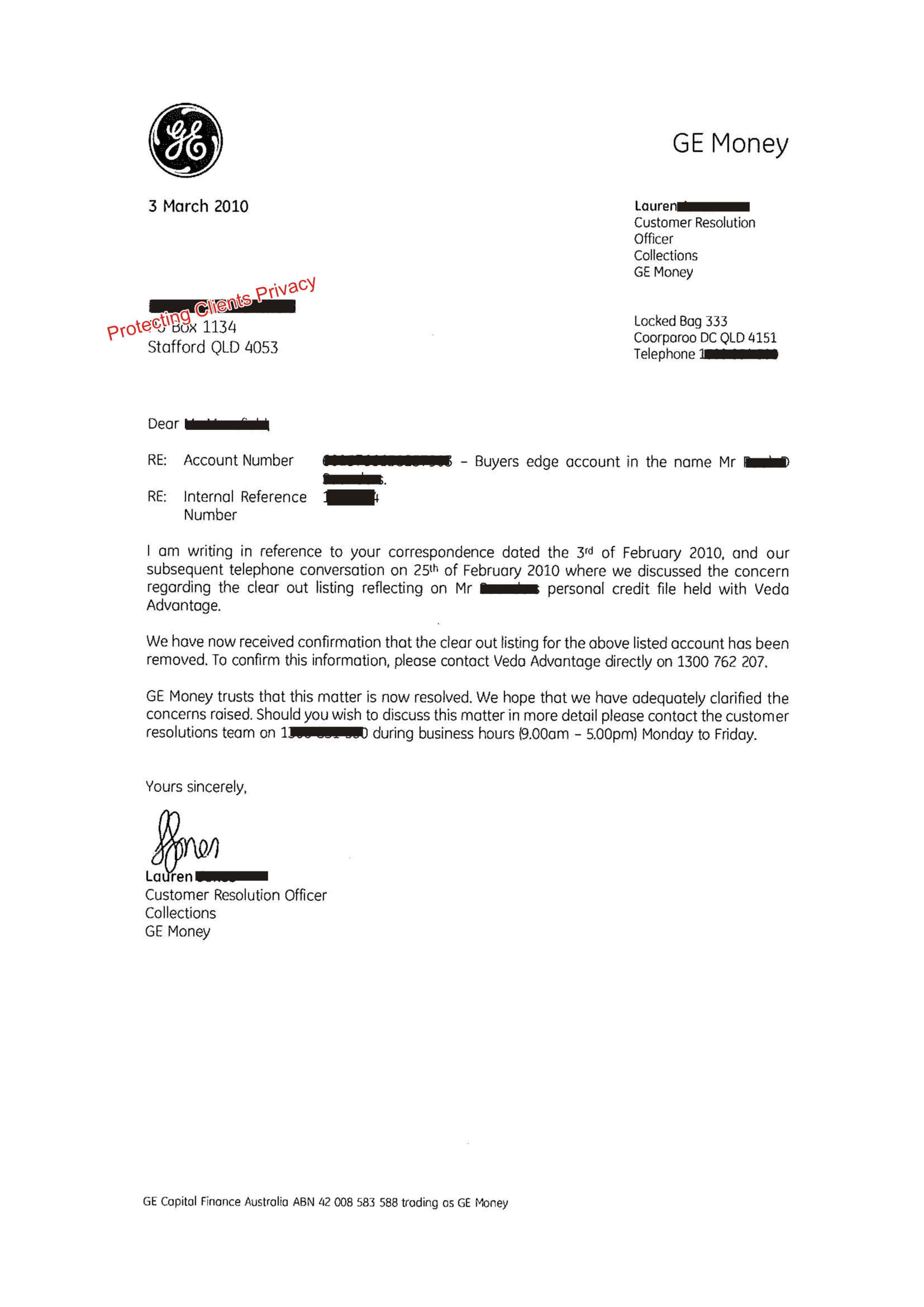Below is a copy of a letter from GE Money confirming the removal of a default from a clients credit file.